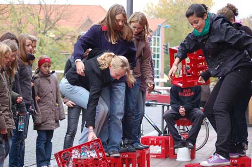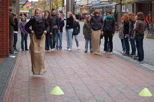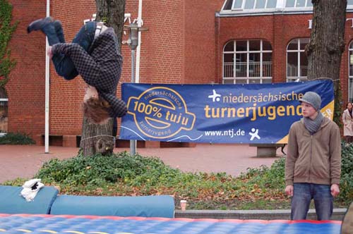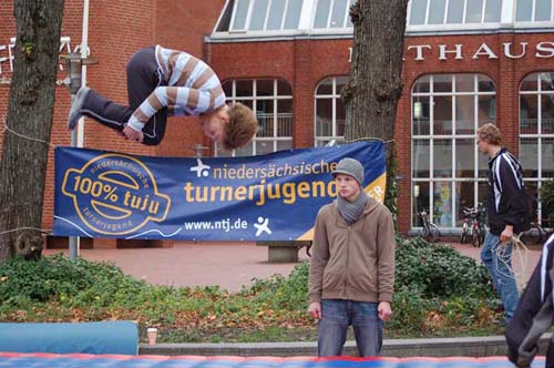 22. - 26.10.2008Der Berg rief und die niedersächsische Turnjugend kamUnter dem Motto Der Berg ruft trafen sich vom 22. bis 26. Oktober Jugendliche der niedersächsischen Turnerjugend in Zeven, wo sie auch von Mitgliedern des TuS Zeven mit betreut wurden. In der "Stadt am Walde" wurden neben Workshops auch Angebote wie Akrobatik, Breakdance, Einrad, HipHop, Luftballonkunst, Skigymnastik, Stuntschule, Trampolinturnen, Abenteuerklettern, Cricket, Indiaca, Spaceball und vieles mehr angeboten. Bei einer großen Außenaktion in der Innenstadt wurden außerdem verschiedene Projekte vorgestellt und Partystimmung kam natürlich an allen Tagen auf. Dafür sorgten auch die allabendlichen Diskos. Den Abschluss der mehrtägigen Veranstaltung bildetet eine große Abendgala am Samstagabend, bevor die Jugendlichen zum Ende der Schulferien wieder in ihre Heimatorte reisten. (Text/Fotos: Jens Zschiesche) |