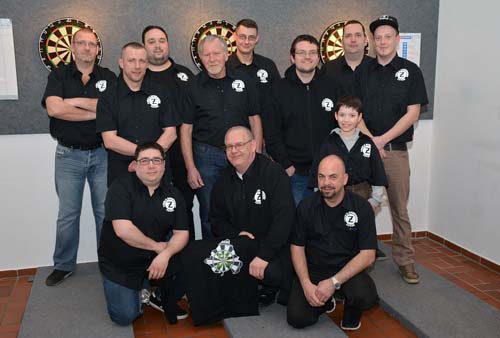 17.03.2016Neue Sparte Darts präsentiert ihre TrikotsAm 17. März präsentierten bei ihrem wöchentlichen Trainingstermin im Vereinsheim des TuS Zeven Auf dem Berge die Mitglieder der jüngsten Sparte des Sportvereins ihre neuen Trikots. Diese sind – neben dem TuS Zeven-Logo - mit dem Logo der Abteilung Steel-Dart versehen, welches auf einer Dartscheibe im Hintergrund die als Karte gezeichnete Stadtgrenze von Zeven zeigt.