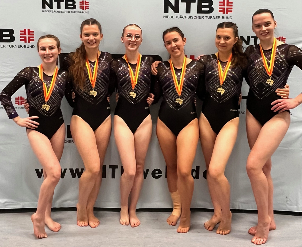 Zevens Nachwuchsturnerinnen nach ihrem Sieg in Winsen/Luhe: 23.11.2024Landesliga Gerätturnen FrauenZevens Turnerinnen gewinnen Landesliga und sichern damit den AufstiegBeim zweiten und entscheidenden Wettkampf in der Landesliga in Wellendorf bei Osnabrück hat unser Team alle in die Schranken gewiesen und sich nicht nur den Tagessieg, sondern auch den Gesamtsieg gesichert. Zevens erste Turnmannschaft, das sind Alison Trumpa, Johanna Behrens, Lee-Ann Kerbel und Sarah, Annalena und Wiebke Tebbe begannen am Stufenbarren und legten einen guten Start hin. Die folgenden Patzer am zweiten Gerät, dem Schwebebalken, konnten durch gute Bodenübungen und absolute Top-Sprünge am letzten Gerät wieder gut gemacht werden. Damit ist der Aufstieg von der Landesliga 3 in die Landesliga 2 gesichert. Endstand Landesliga 3 Turnbezirk Lüneburg 2024 Gerätturnen: